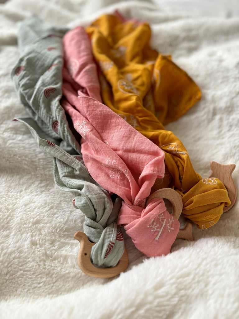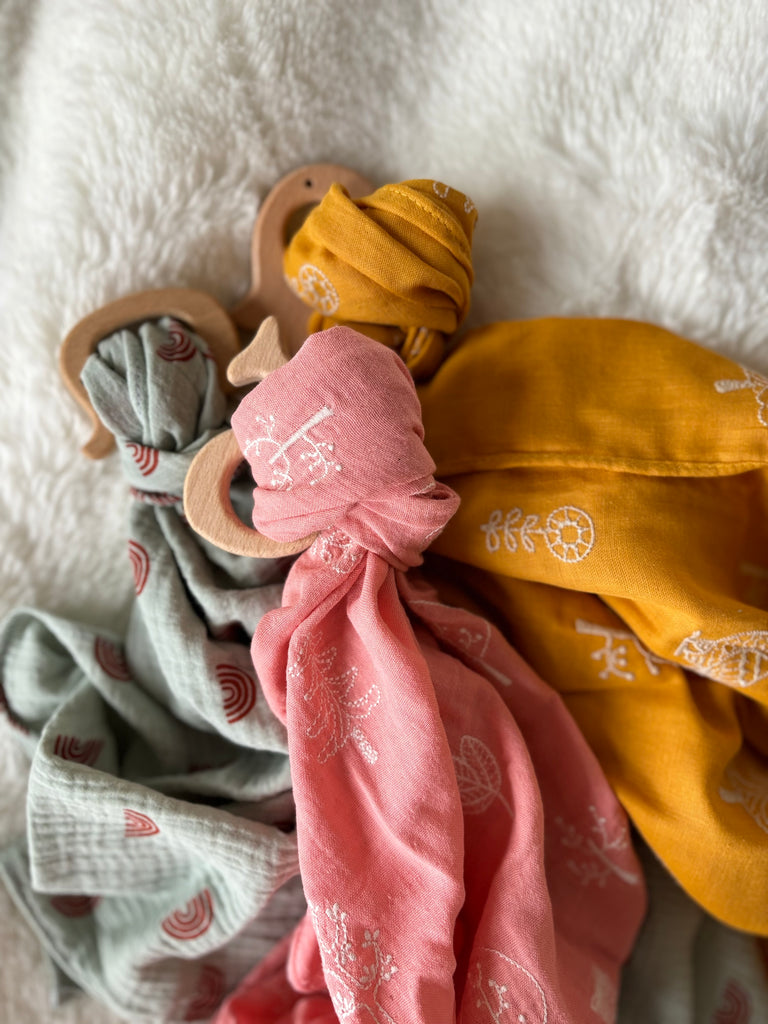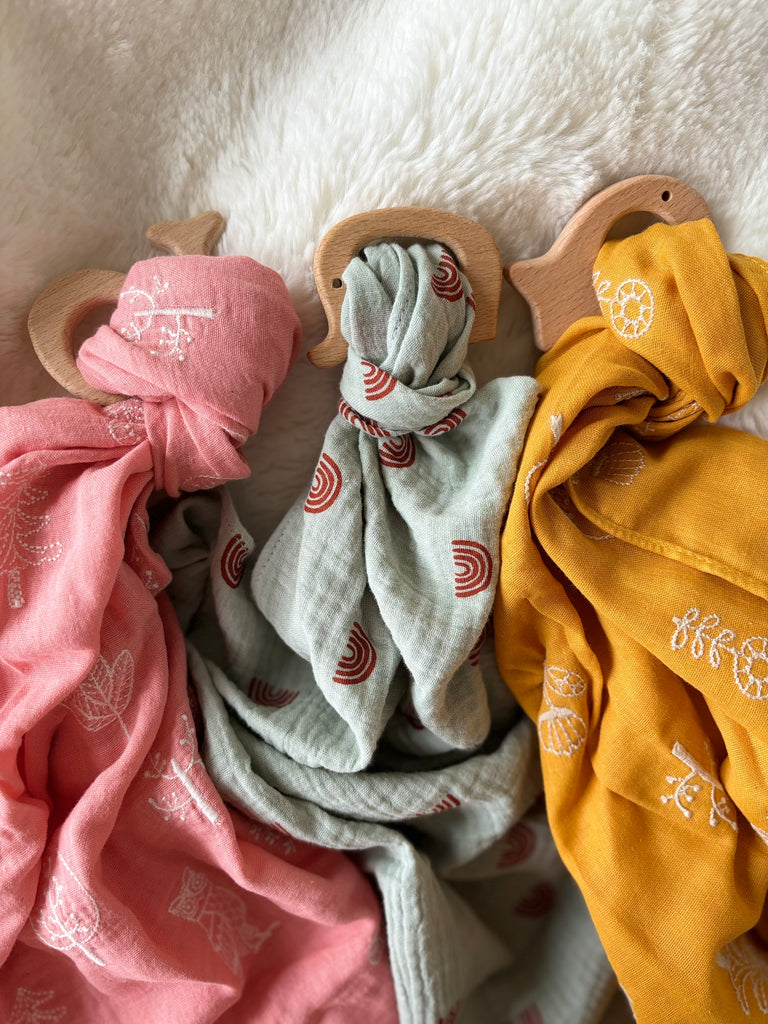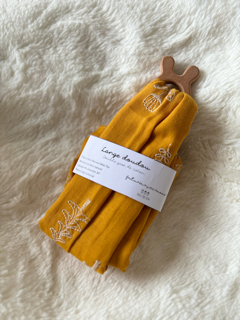 ᑎᝪᑌᐯᗴᗩᑌ Lange doudou double gaze avec anneau en bois naturel
