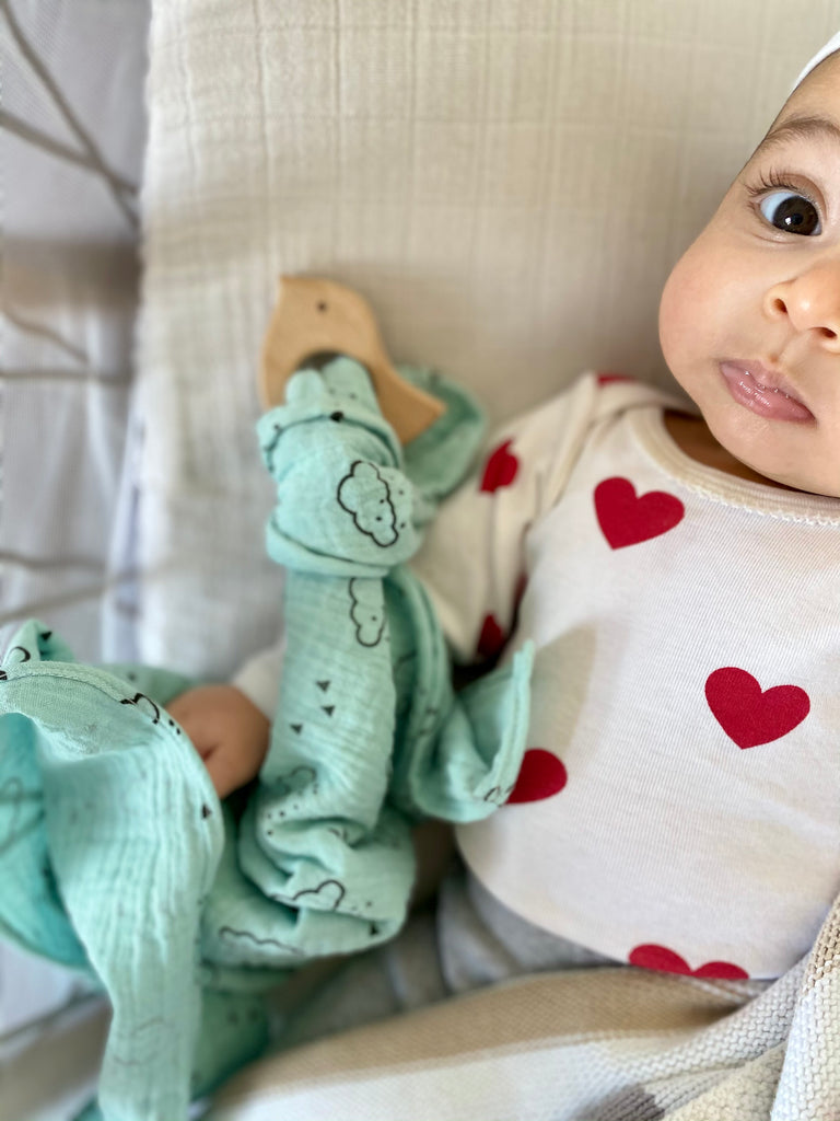 Un joli lange tout doux en double gaze de coton et broderies ou imprimé arc en ciel pour essuyer les petites régurgitations ou l’imprégner de l'odeur de maman pour rassurer bébé!