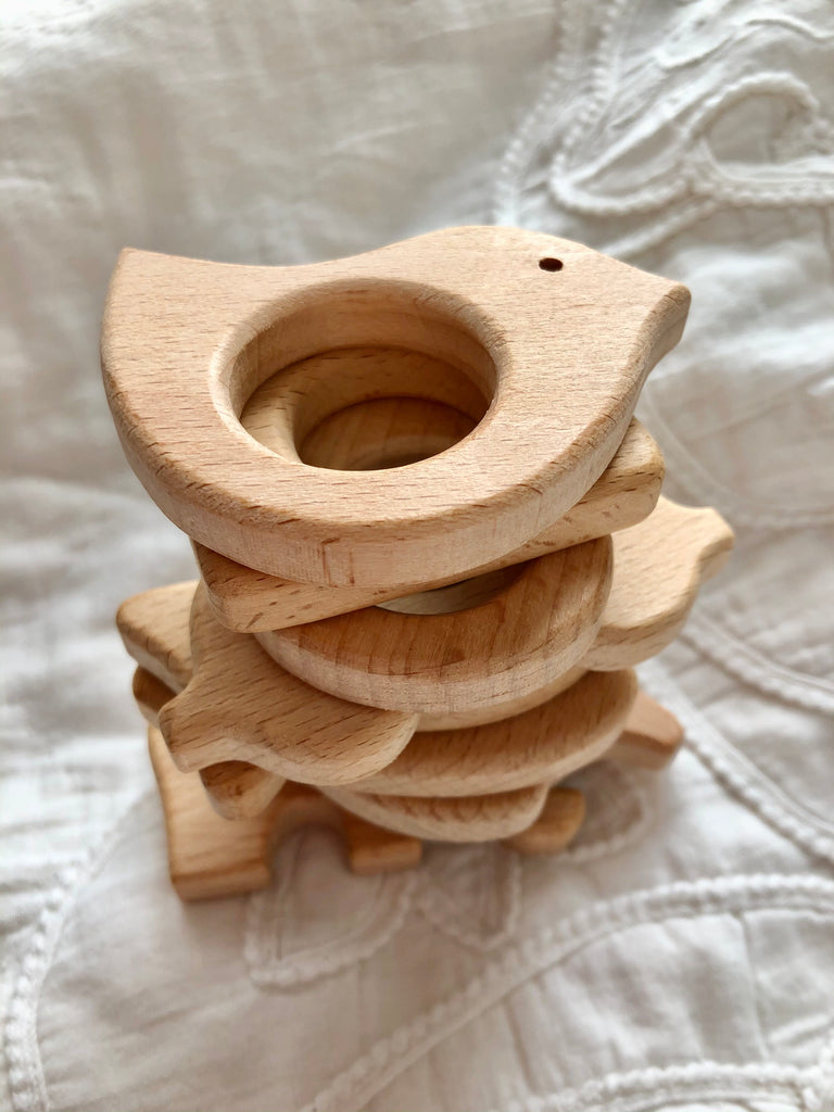 Anneau de dentition et jeu en bois naturel de petite taille, idéal pour les premières préhensions de bébé, à laver à l'eau claire et au savon.